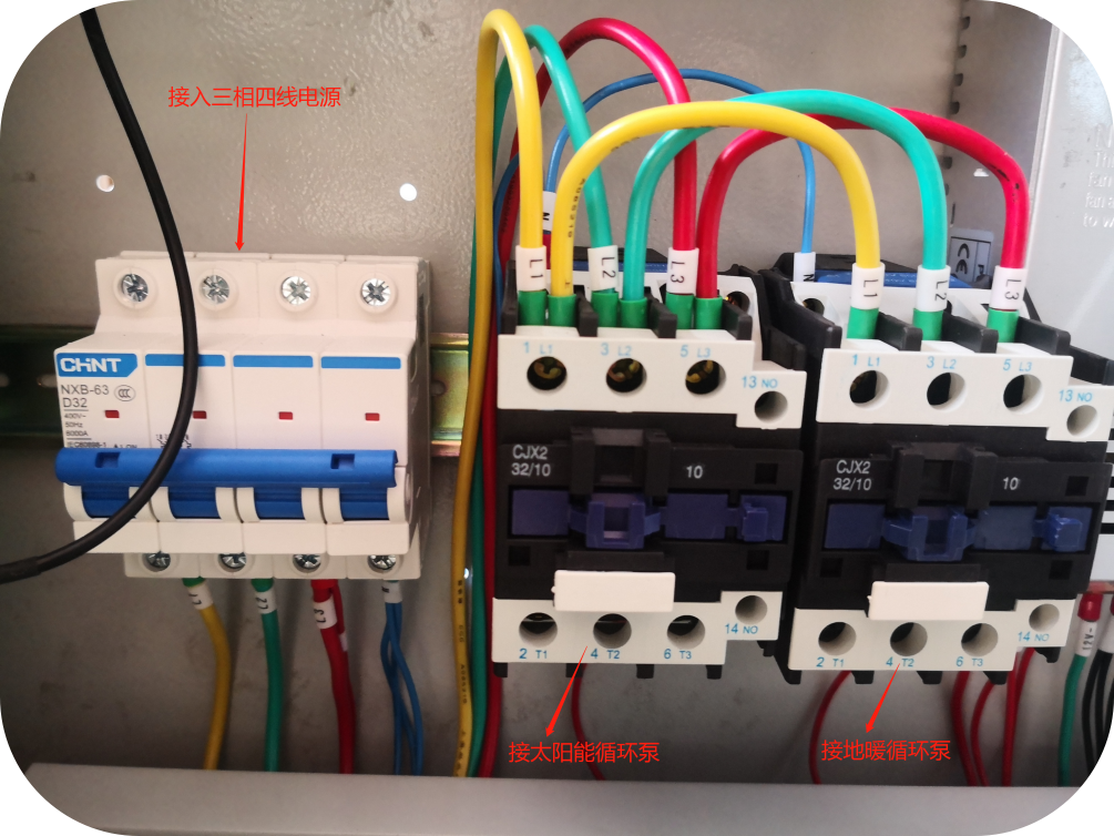 如下圖所示,安裝指示標識正確接入線路,空氣開關依線號接入三相四線電源,交流接觸器輸出端分別接太陽能循環泵和地暖循環泵。
